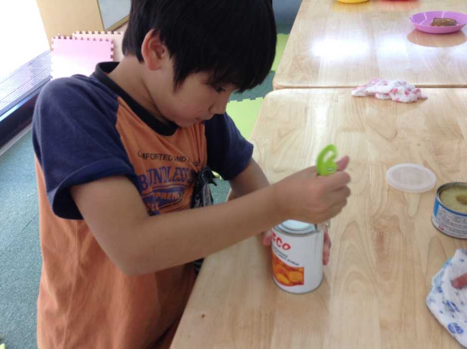 焼き上がりを待つ間にトッピング用のミカンとパイナップルの準備です。缶を開ける手つきも慣れたもの・・・お見事です!!
