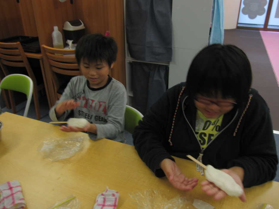 きれいにこねて、割りばしにくっつけます。なんだかおいしそう!(^^)!