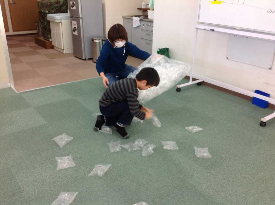手で叩いて割るお子さん、一つ一つ確実に押して割っていくお子さん、さまざまいましたが、30秒間集中して取り組んでいました。