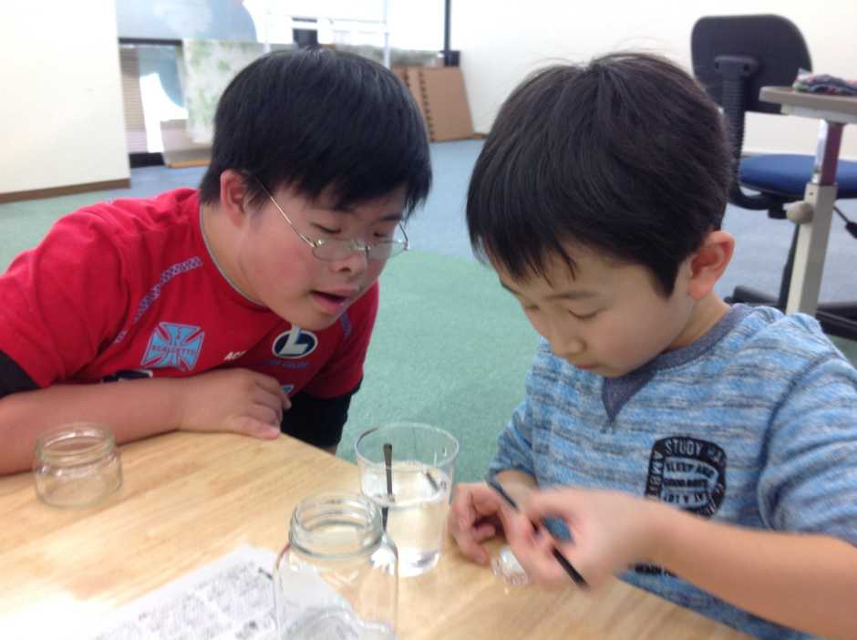 精製水やのりはカップの目盛まで入れていきます。とても真剣に目盛に注目して、入れていました。