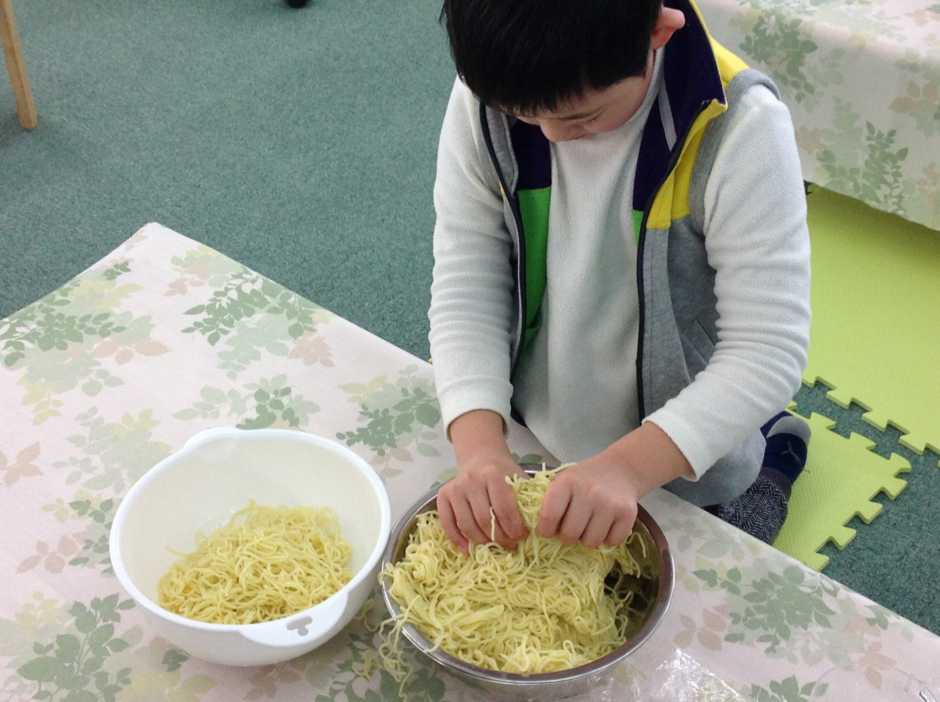 キャベツを千切る、麺をほぐす、ニンジンとソーセージを切る。担当の子ども達それぞれの目は真剣そのもの!家でもお手伝いをしているんでしょうか、みんな仕事が丁寧で安心して見ていられました。