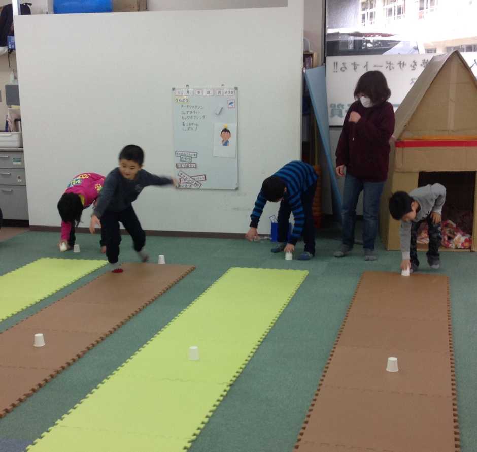 カップとり競争は、今日は前進しながらカップを拾い集めました。