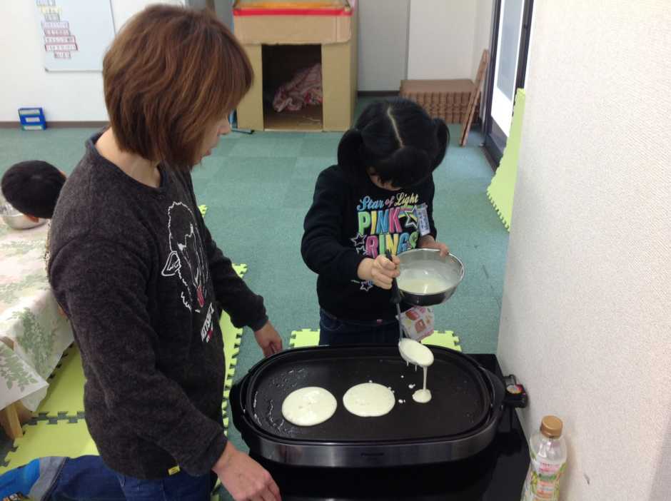 なめらかに混ざった生地をホットプレートに丸く流し入れます。以前は恐る恐る行っていたお友達も今日はとっても上手に出来ました。