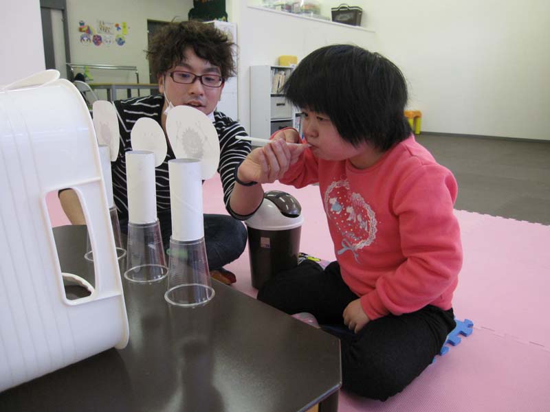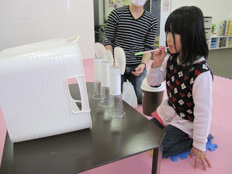 ストローの先端にキャップをはめ、息を吹いて的をたおします!