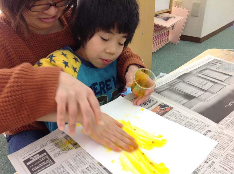 わあ、きれい!絵の具を画用紙に垂らすと、大胆に手で塗り広げてくれました