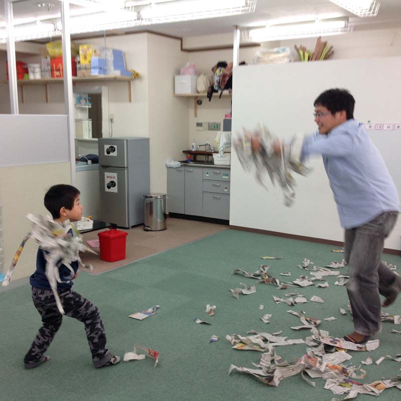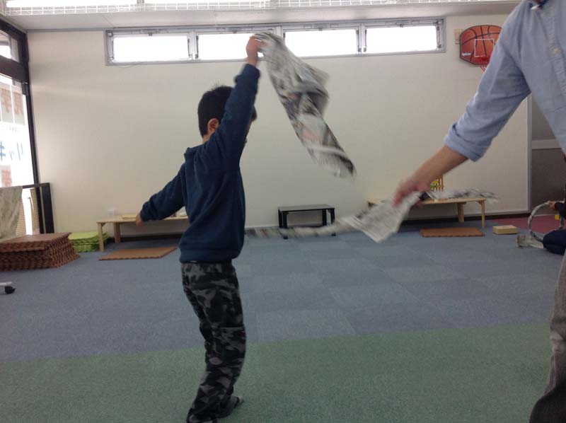 自由遊びの中ではありますが、筒状にした新聞紙を剣に見立てて戦いごっこやヘビごっこなどもしました。