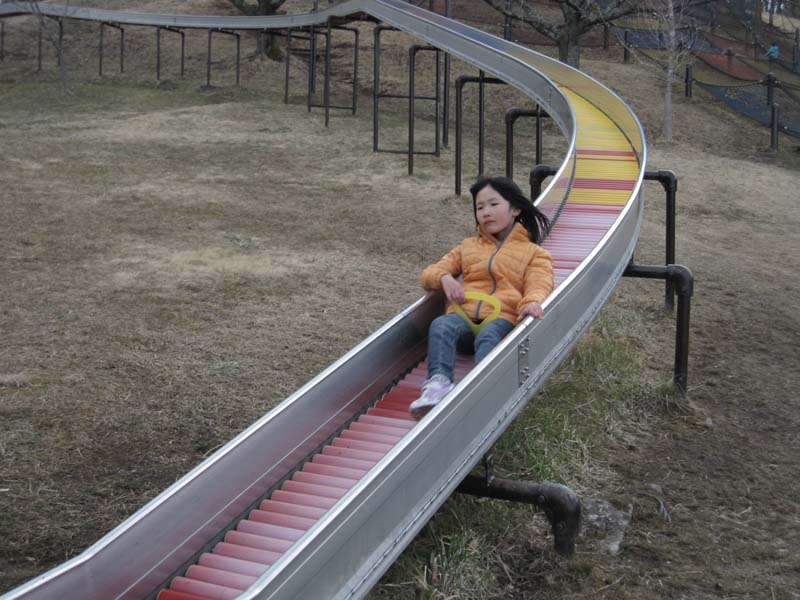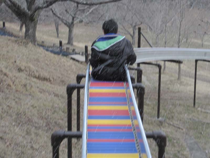 ゆきが ちらつくなか なんども ながいすべりだいを たのしみました!