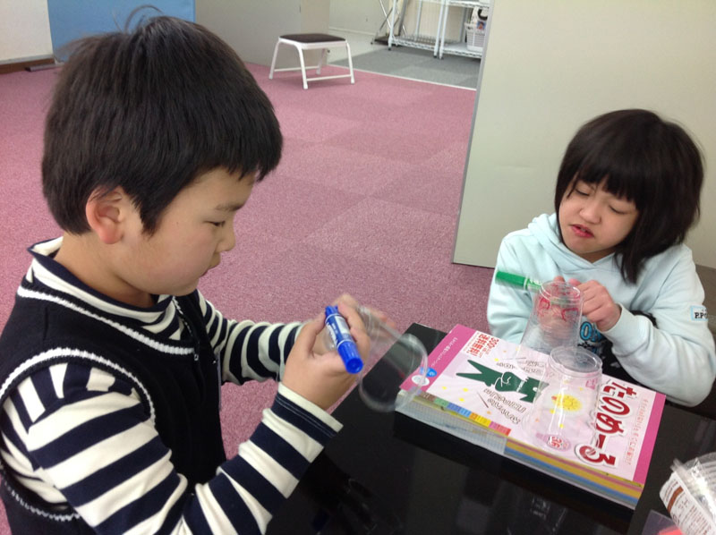 おやつの後はプラスチックのコップを使って「コップラバン」を作りました。