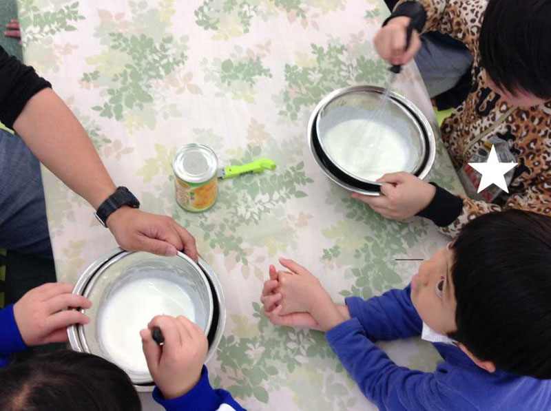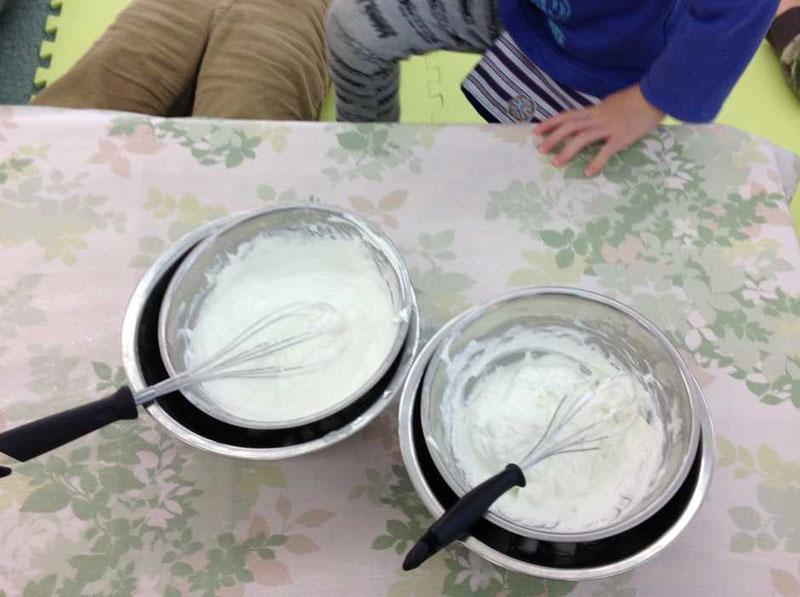 みんなのがんばりのおかげで、しっかりと「ツノ」のたつ生クリームができあがりました。