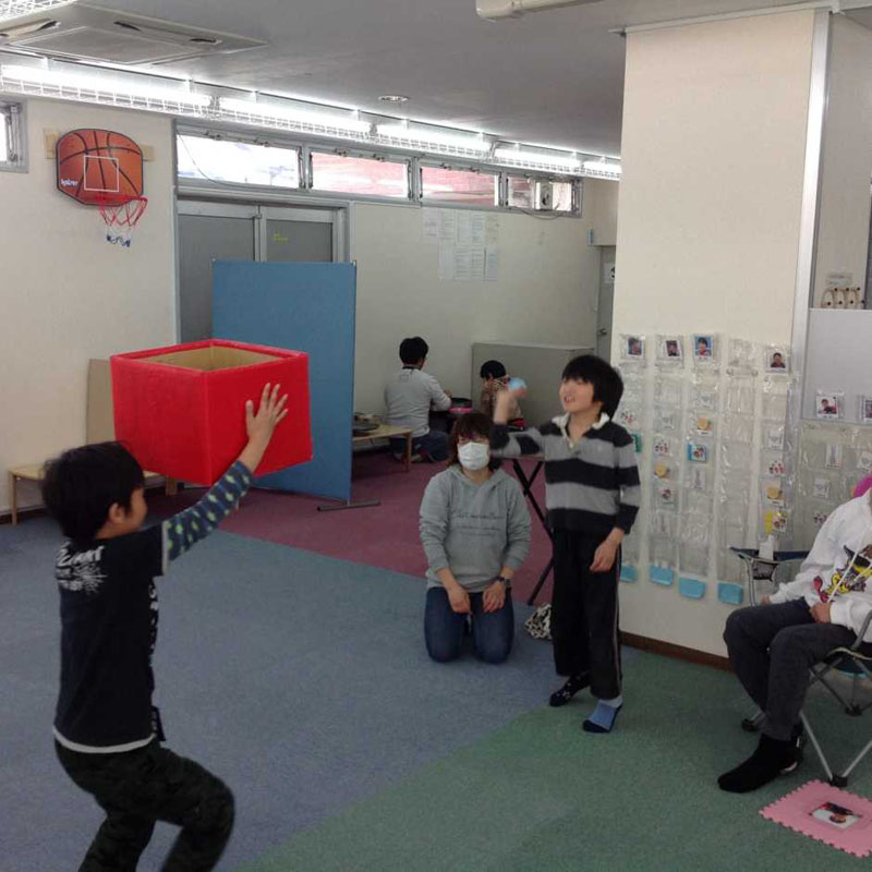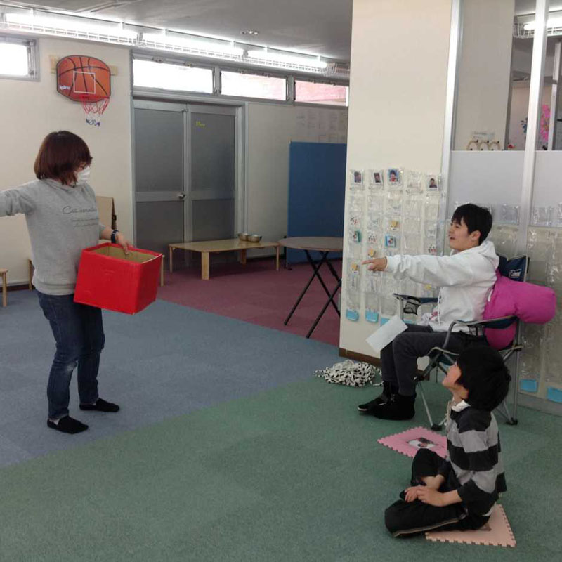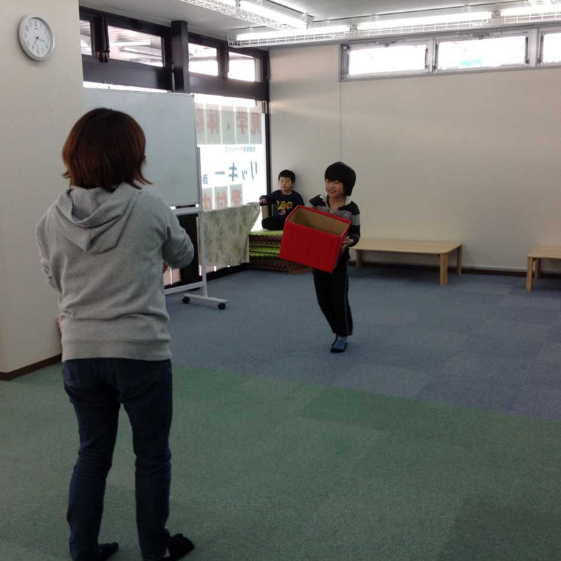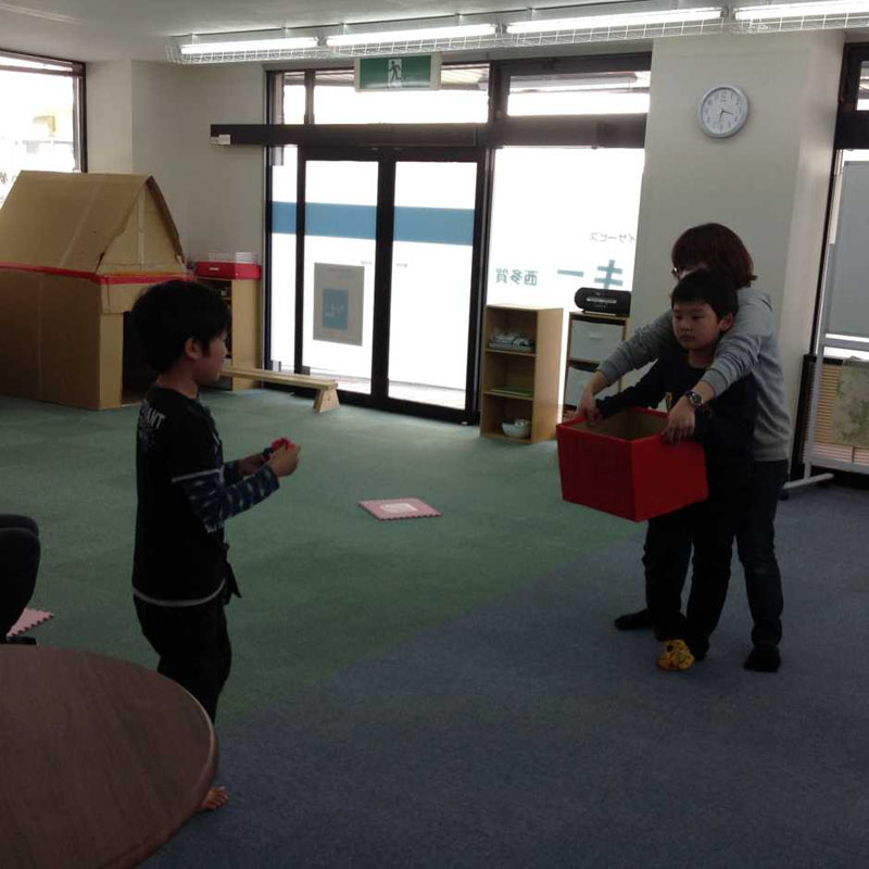 投げる役は指さしをして、「遠く」「近く」「右」「左」と受け取る役のお友だちにヒントを出します。