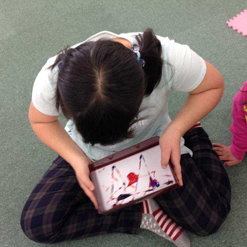 箱の中のビー玉をたくさんころがしたり動かしたりして、絵の具の線を描いていきます。