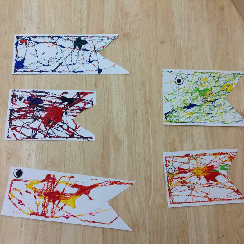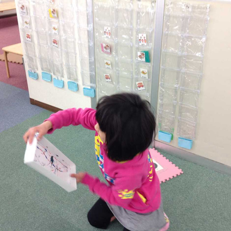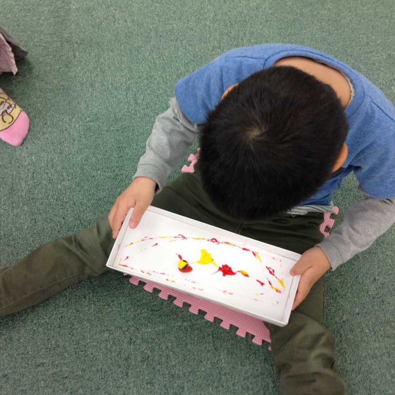 次は絵の具をつかって、「ビー玉ころがしゲーム」に挑戦。