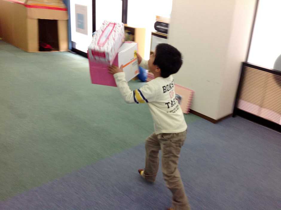 いろんな大きさのちがう箱(ダンボール、ティッシュボックス、水筒の箱)を