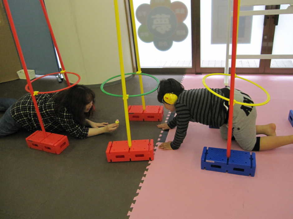 輪っかと自分の身体(頭や足)の位置関係を気にかけます。