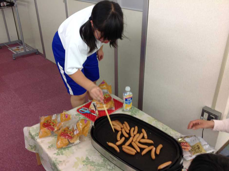 一人2本の指示をちゃんと守り、切り込みの入ったパンにソーセージをはさんで・・・