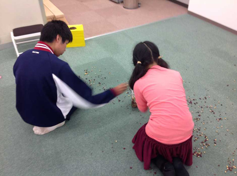 大豆や小豆、大納言などなど、大小さまざまな豆の中に数字のパズルを投入!