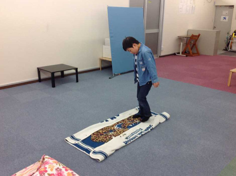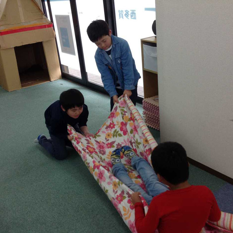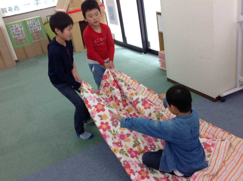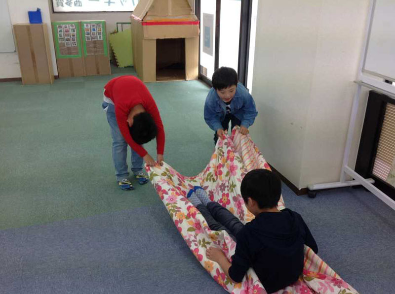 タオルのソリをお子さんたち同士にひっぱってもらいました。