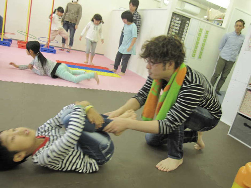 サーキット運動を行っている間には、個別でのトレーニングも行いました。(えびぞり ひざをかかえてゴロン 両足跳び)