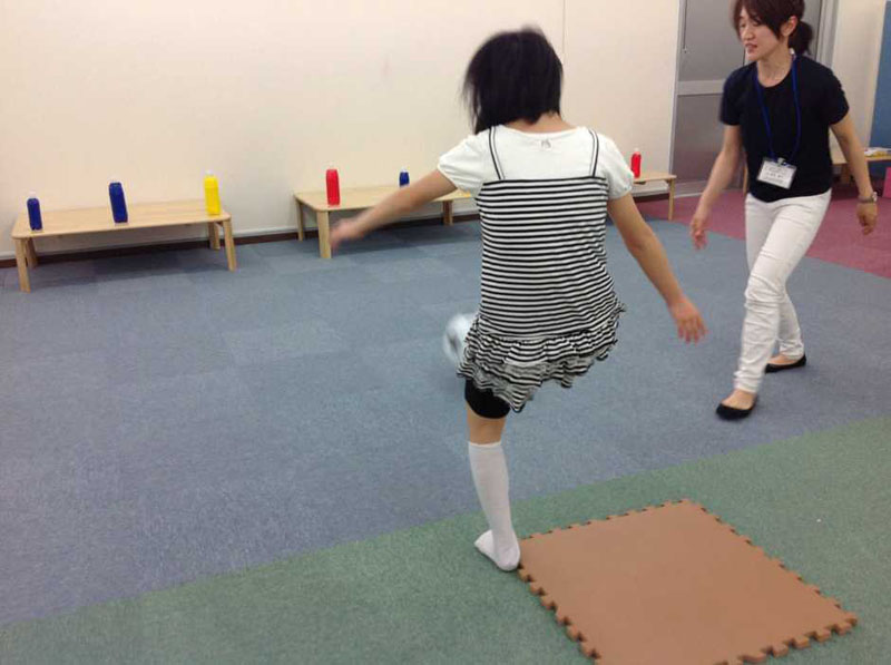 的当てサッカーは、少し高いところにあるペットボトルを狙います。