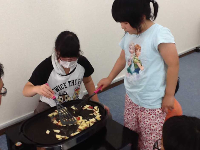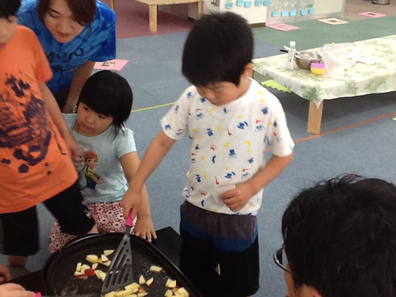 そして今日のおやつはみんなで、リンゴ入りのホットケーキをつくりました。