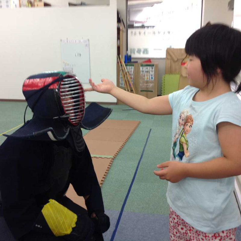防具に興味しんしん♪『たたいても痛くないの?』と面を触ってみてみました。