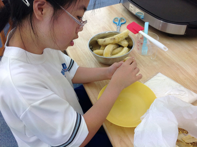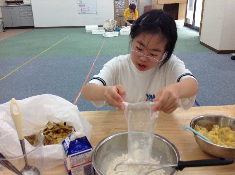 今日一番ノリで到着してくれたお子さんが、みんなのおやつを作ってくれました。バナナをつぶして、粉を混ぜて・・・