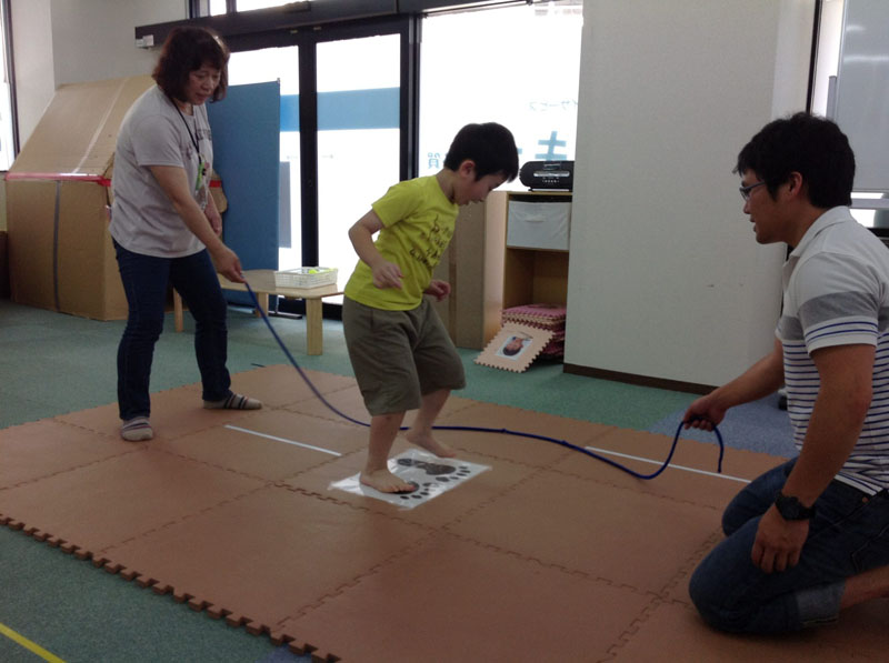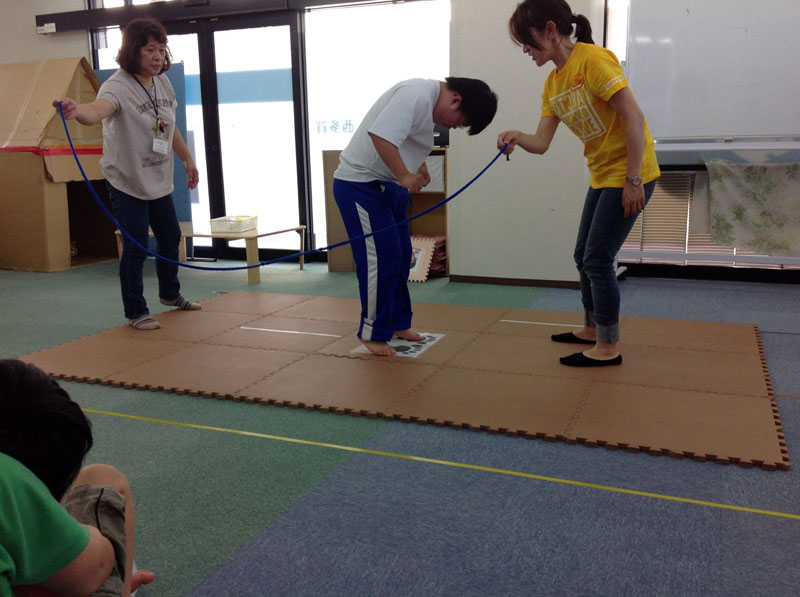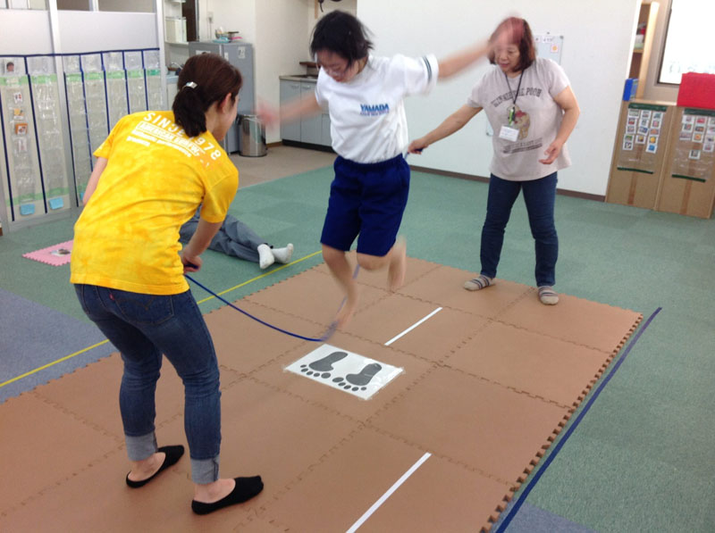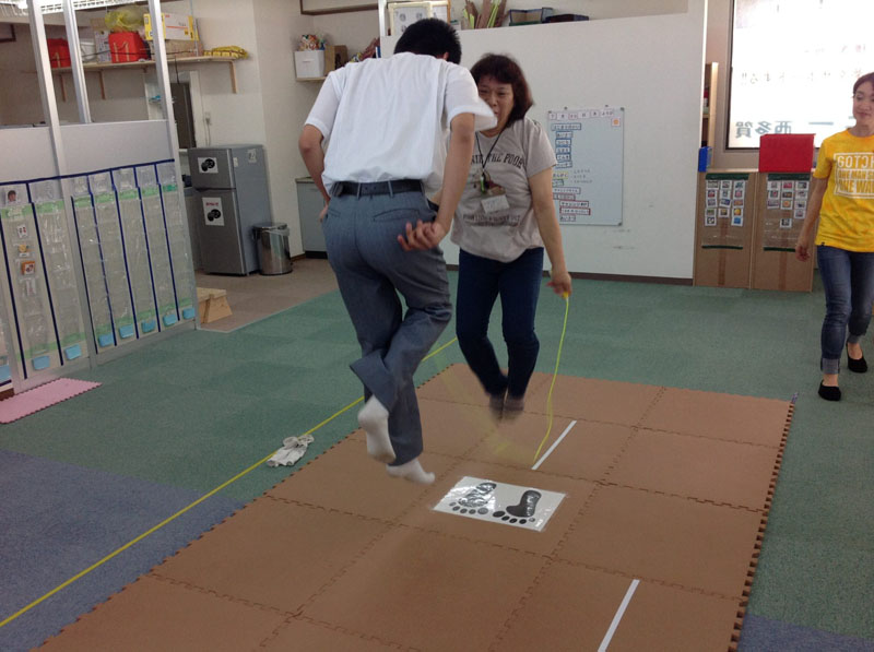 最後に大なわとび。足型のある定位置で跳び続けようね。