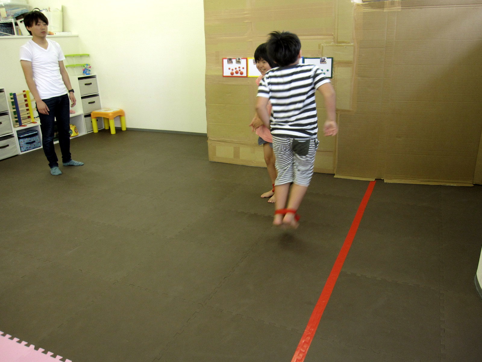 まずは、まねっこゲームから。向かいにいるサポーターの「まね」をします。