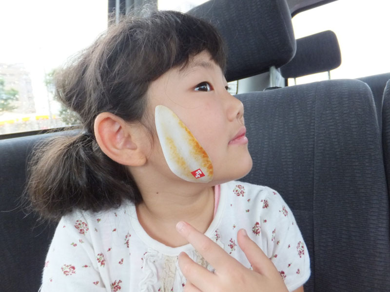 かまぼこのシールを ほっぺたにはっちゃった!