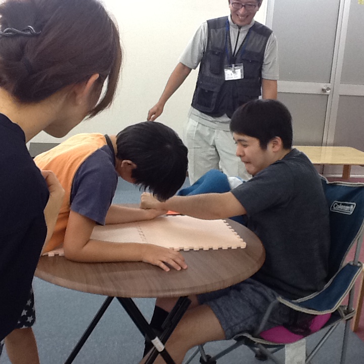 初めてのお子さんは、自分の腕を左右のどちらに倒すのか分かりにくかったようですが、「〇〇くんはこっちに倒してね」と腕を補助すると理解してくれました。
