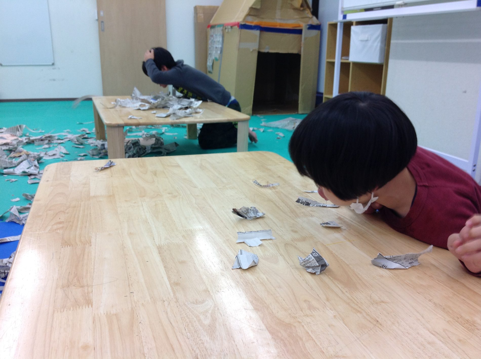 手や身体を使わずに、息だけで、テーブルの上の新聞紙を落としていきます。