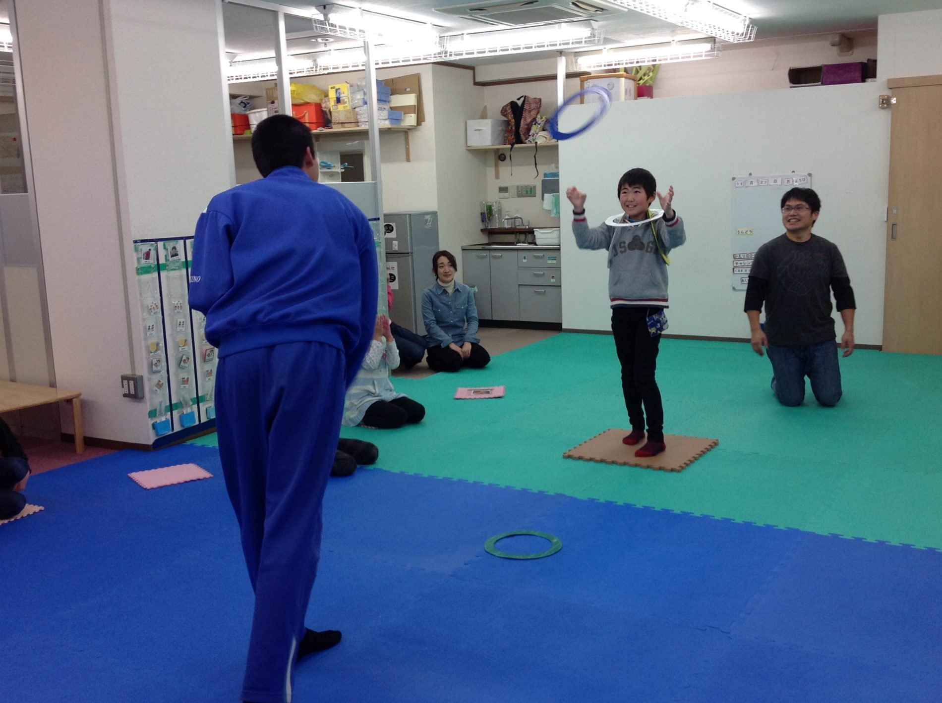 大きいお友だちが輪っかを投げてくれ、他のお友だちがチャッチです。