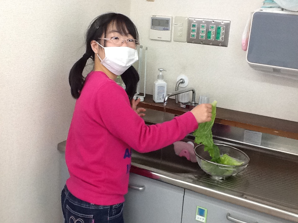 最初に来てくれたお友だちにレタスを洗ってもらったり、フライドポテトを作ってもらいました。