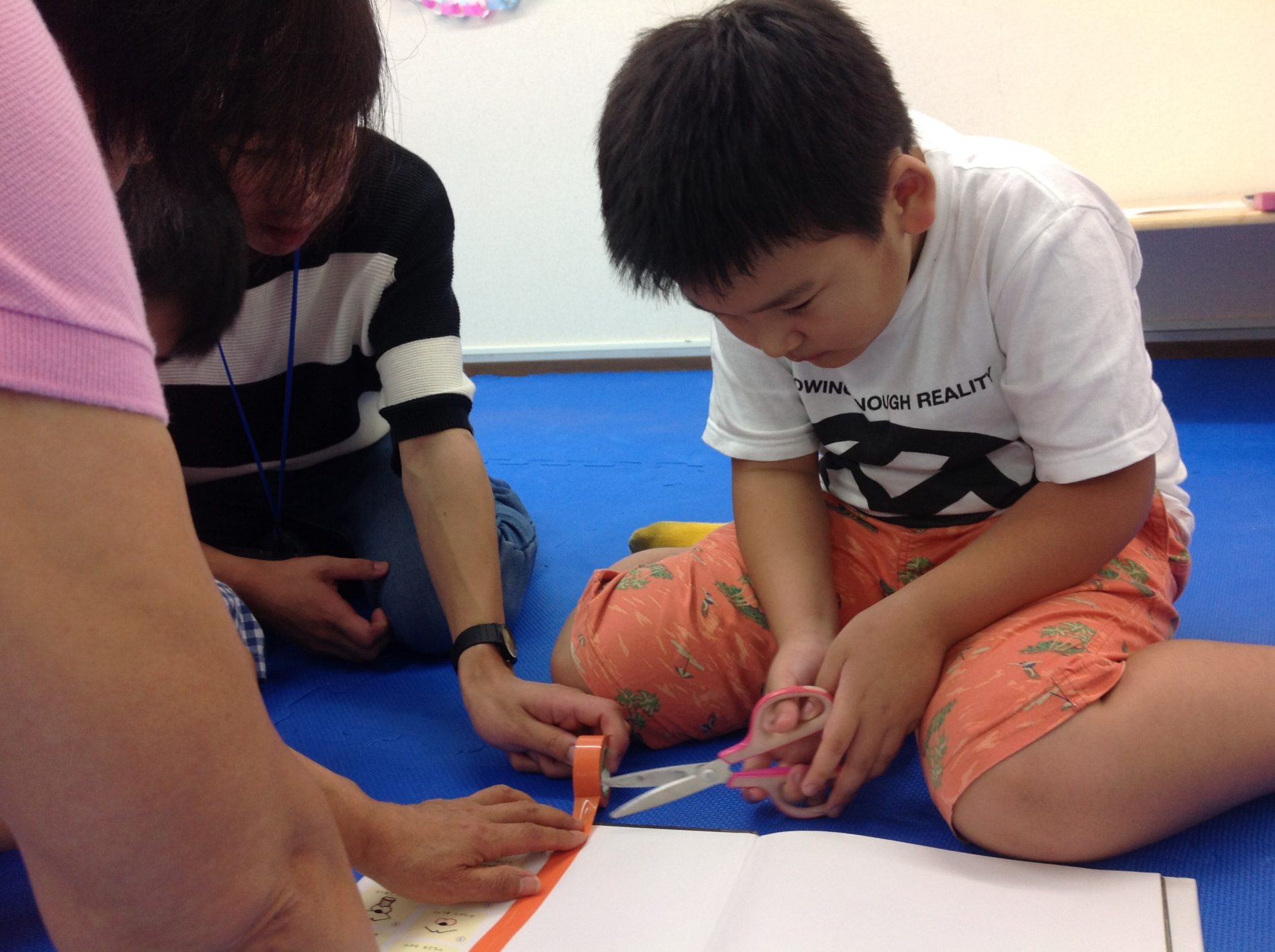 読み聞かせ前に、表紙のズレが気になるようで「テープ貼ります」「テープかしてください」と