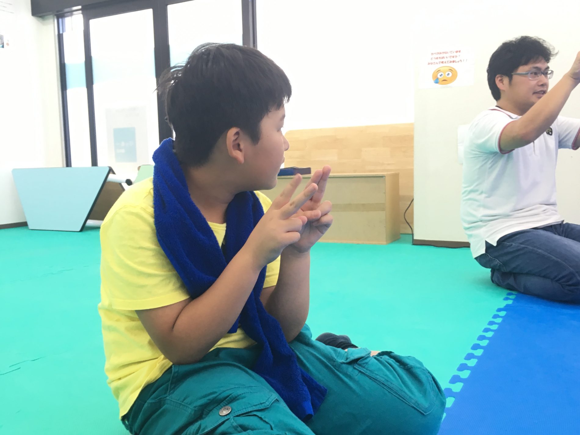 サポーターの身ぶり手ぶりを見てマネをしているお子さん。