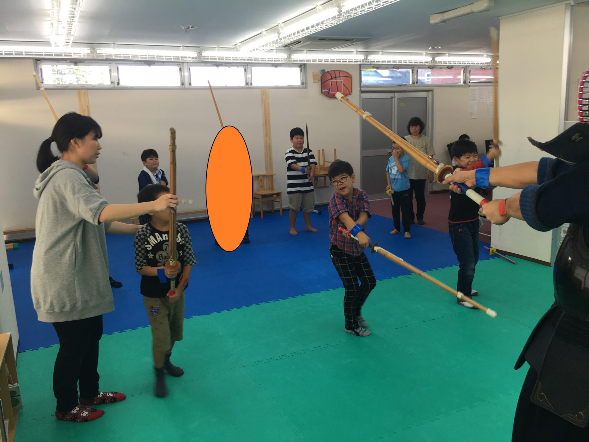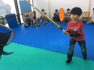 子ども達の心と体も強くなってほしいので、今日の活動は剣道にみんなで挑戦しました。