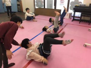 そして最後に受け身です。腹筋できたえた部分をつかって、おなかにしっかり力を入れて、受け身をとることができていました!