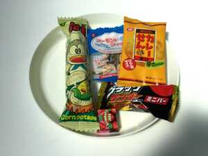 今日のおやつ{カレーせん うまい棒 チロルチョコ アーモンドフィッシュ ブラックサンダー}