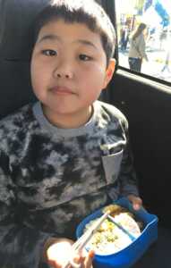 到着してお昼ご飯は広い原っぱで食べる予定でしたが風も強く吹いていたので車内にて食べることにしました。