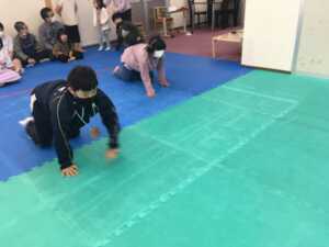 今日の活動は、体力作り(両足ジャンプ、二人三脚、膝歩き、ハイハイ)です。