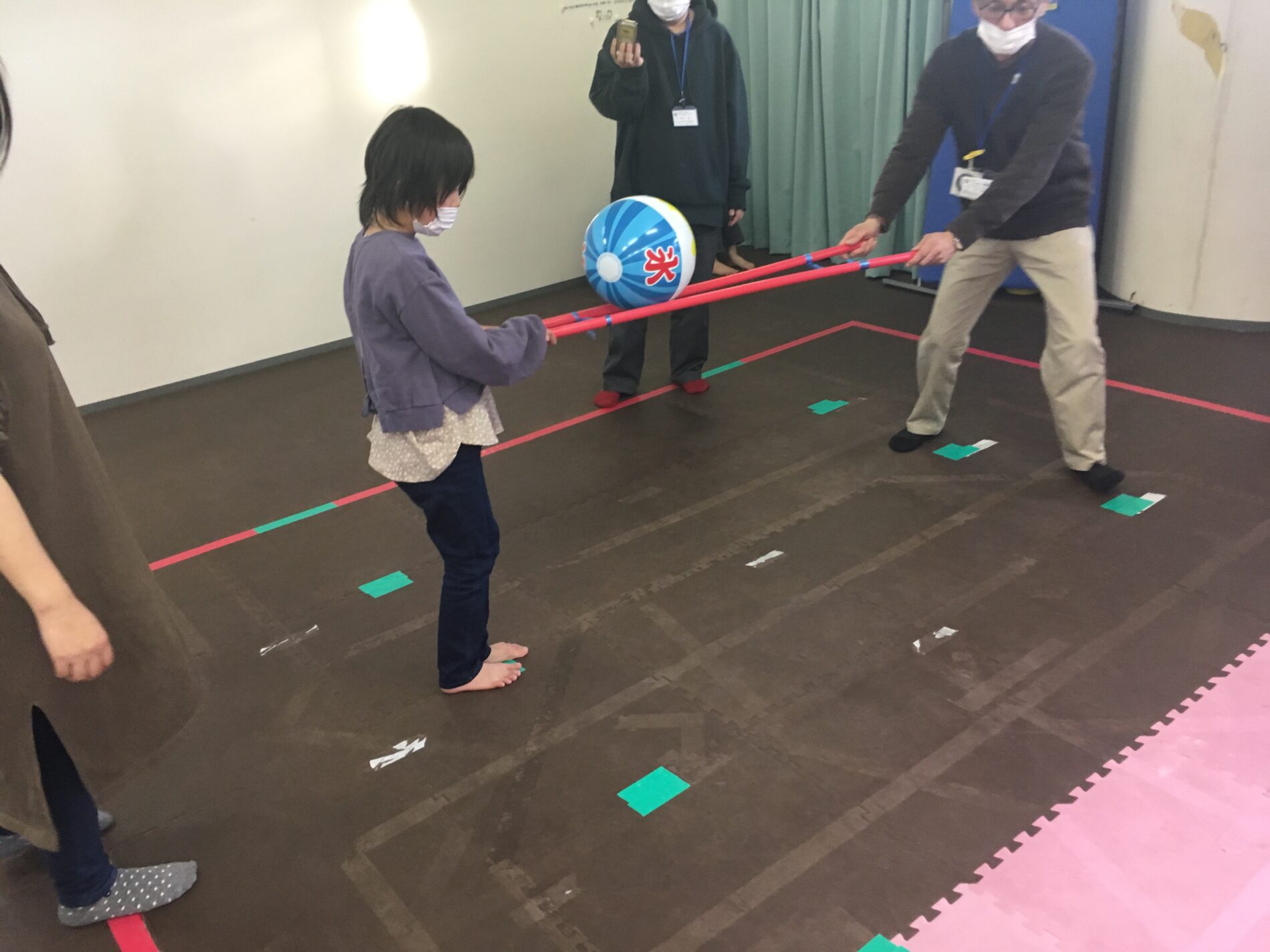 次に「線の上を歩いてフェイスタオルでボールを運ぶ」をしました。