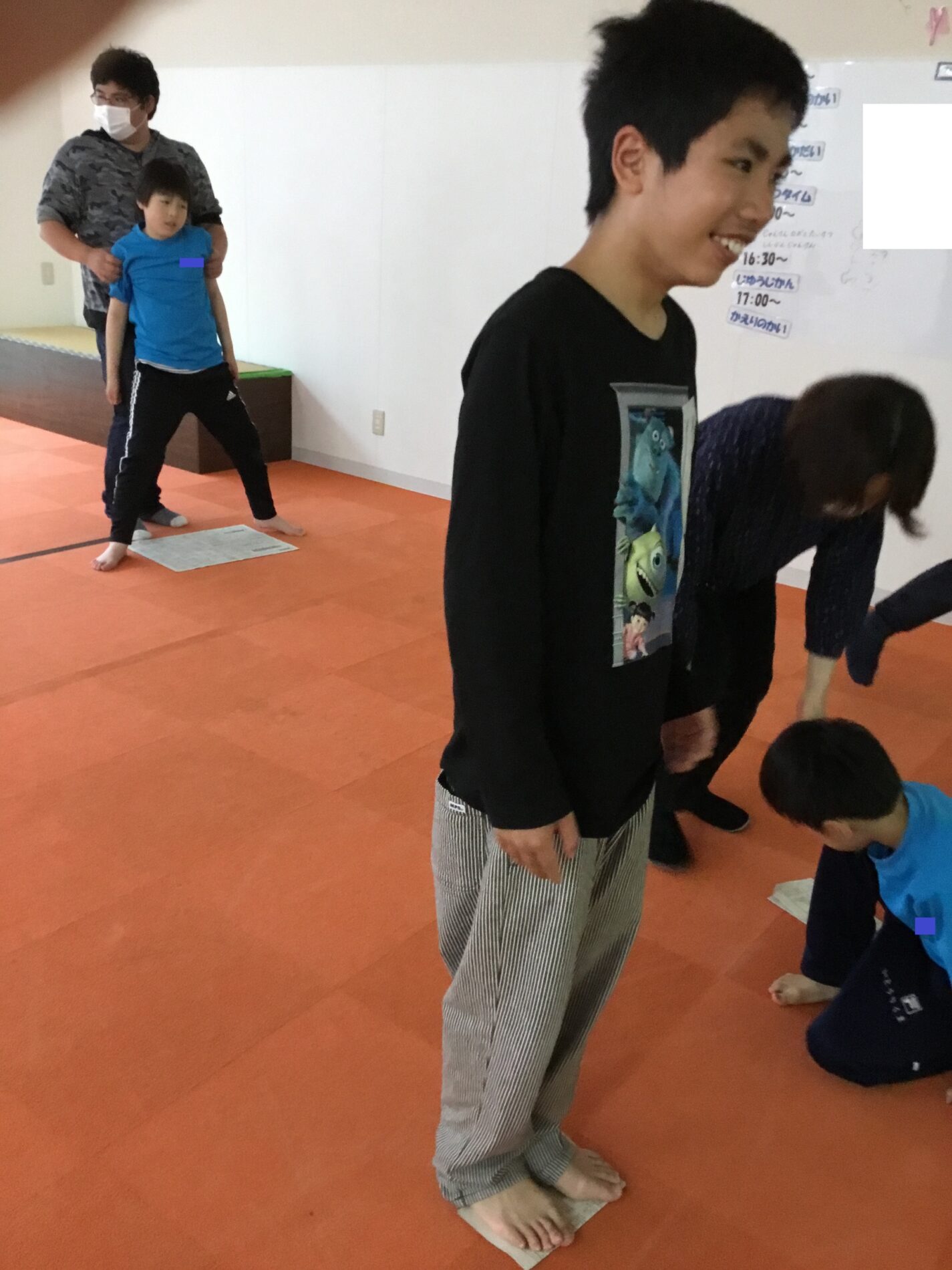 今日の活動は雨が降っているので室内でじゃんけんロボと勝負をして、負けると新聞紙を折りたたんでいくゲームをしました。