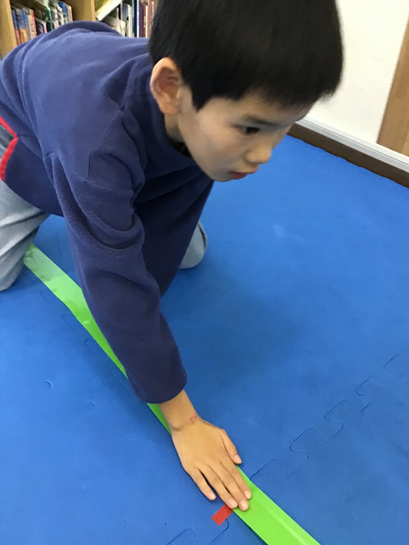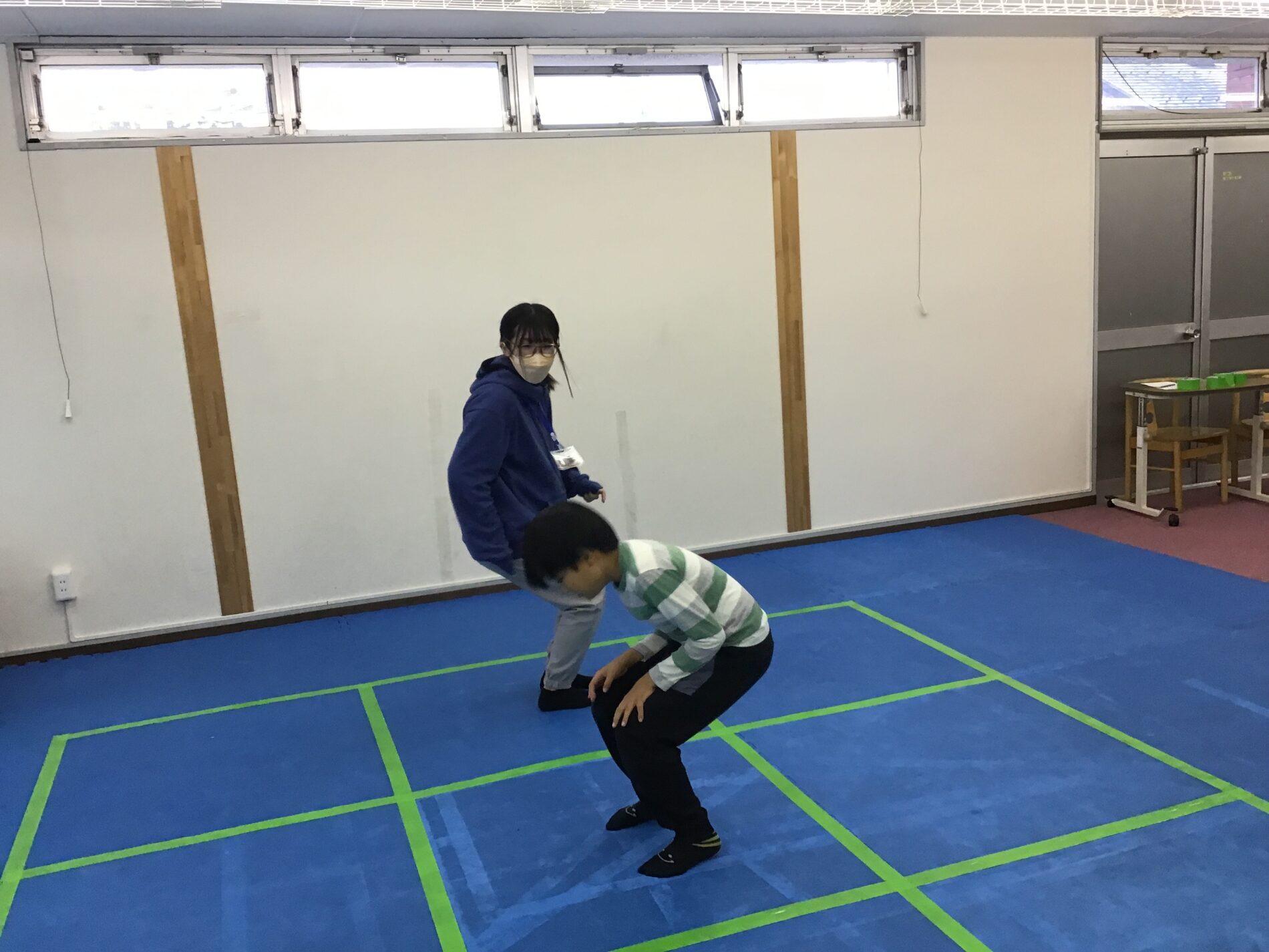 この鬼ごっこは、9マスの中に鬼とプレイヤーがいて、「いちにのさん」の掛け声で、前後左右斜めの1マスに移動します。鬼と同じマスに入ってしまったら、鬼の勝ちです。ゲームのお約束、コートを自分たちで協力して作る、ゲームの説明を聞く、デモンストレーションの後に、ゲーム開始です。このゲームの狙いは、「空間把握力」「相手の行動予測」「協力して作業する」です。