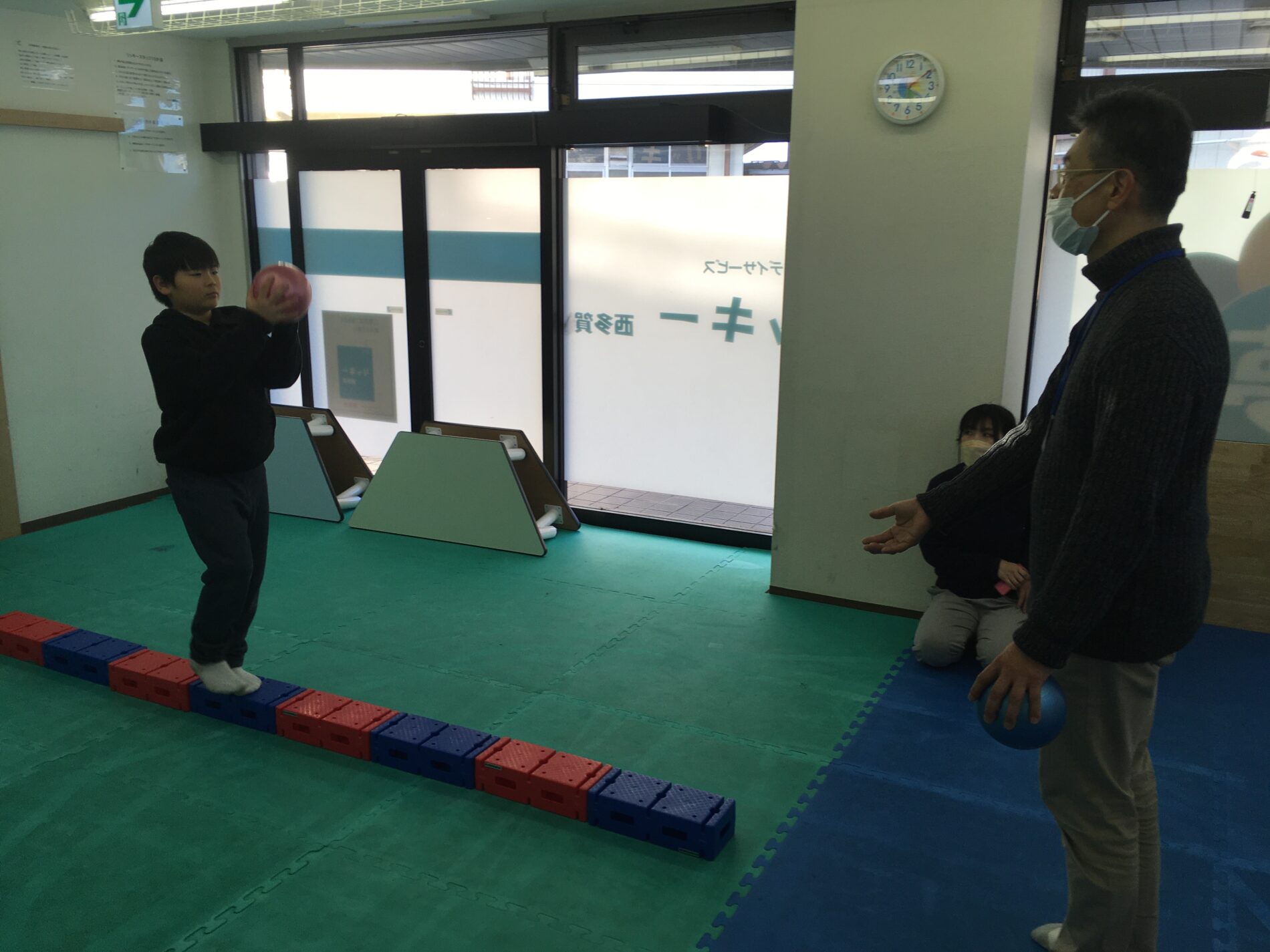 最初、平均台の上をゆっくり歩き、歩きながらボールを取るサーキットを行いました。