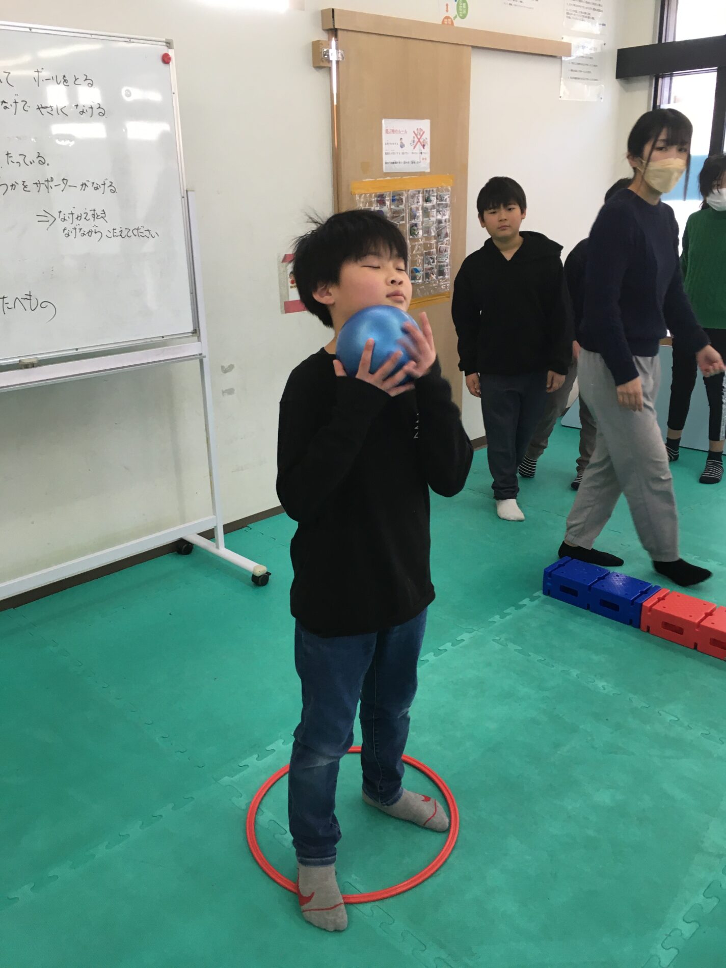 次は、サークルの中に立って、赤と青のボールを受け取るサーキットです。