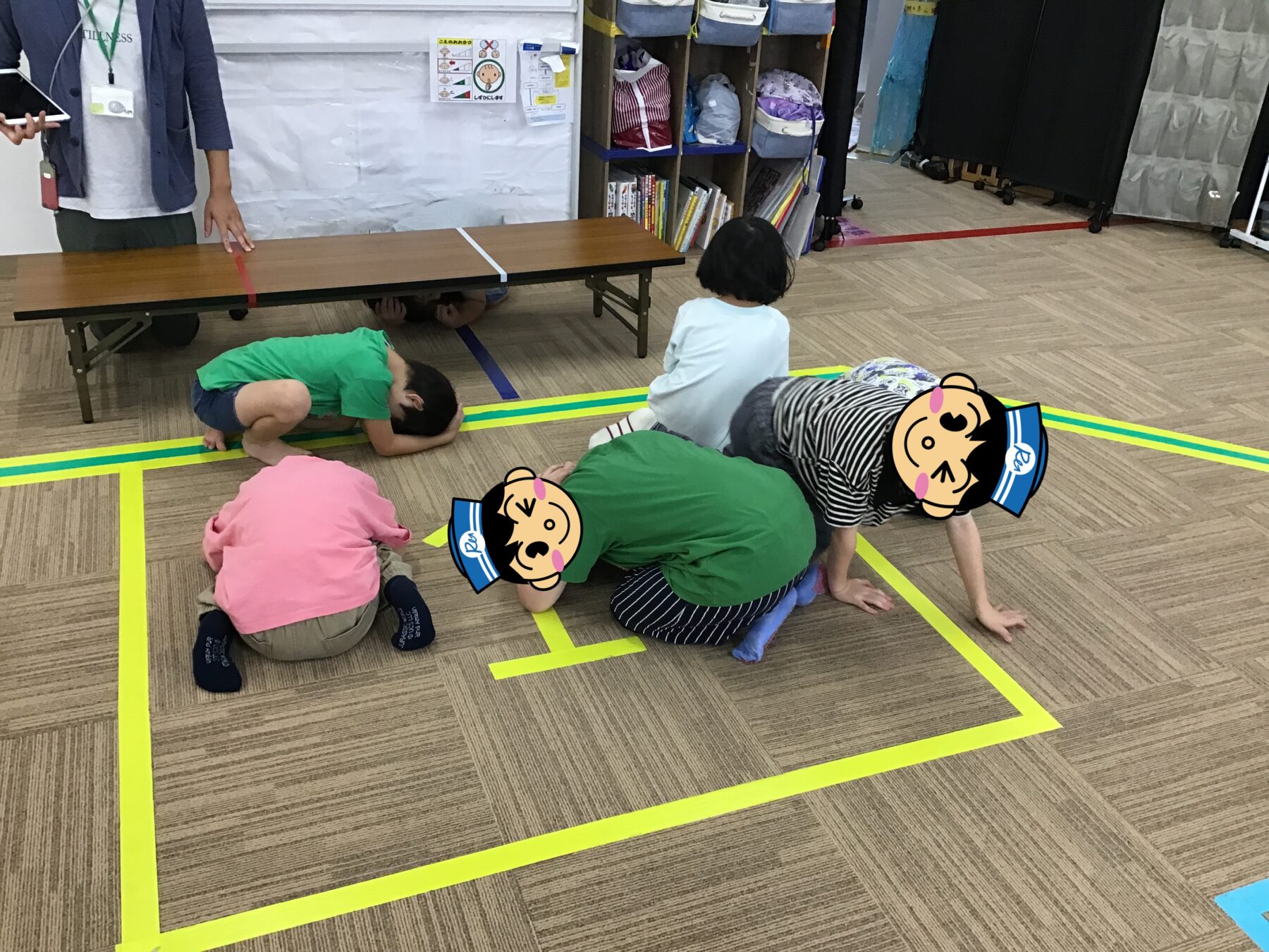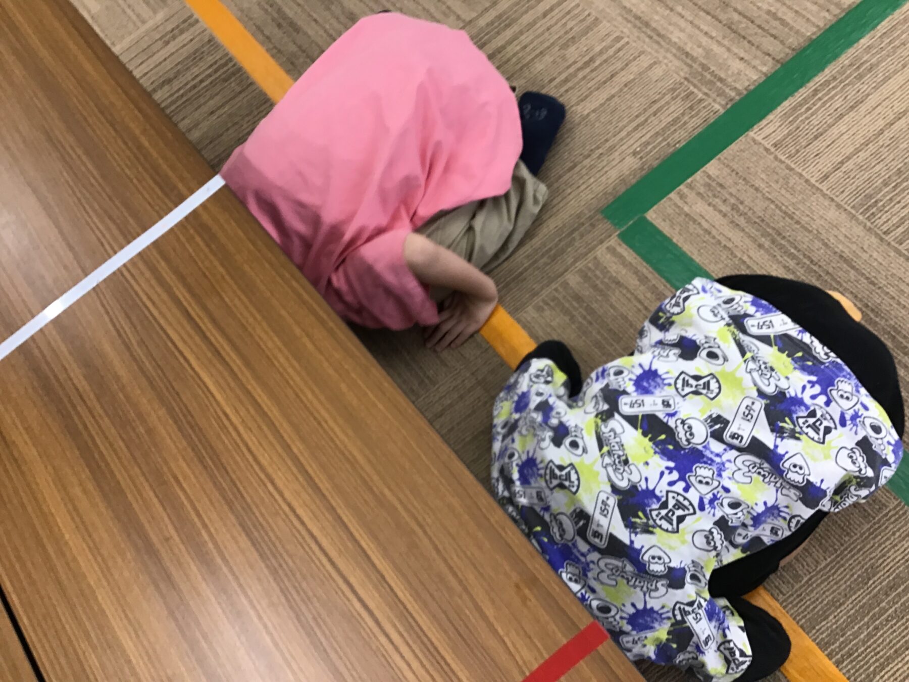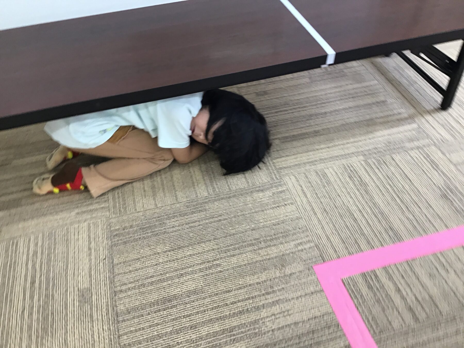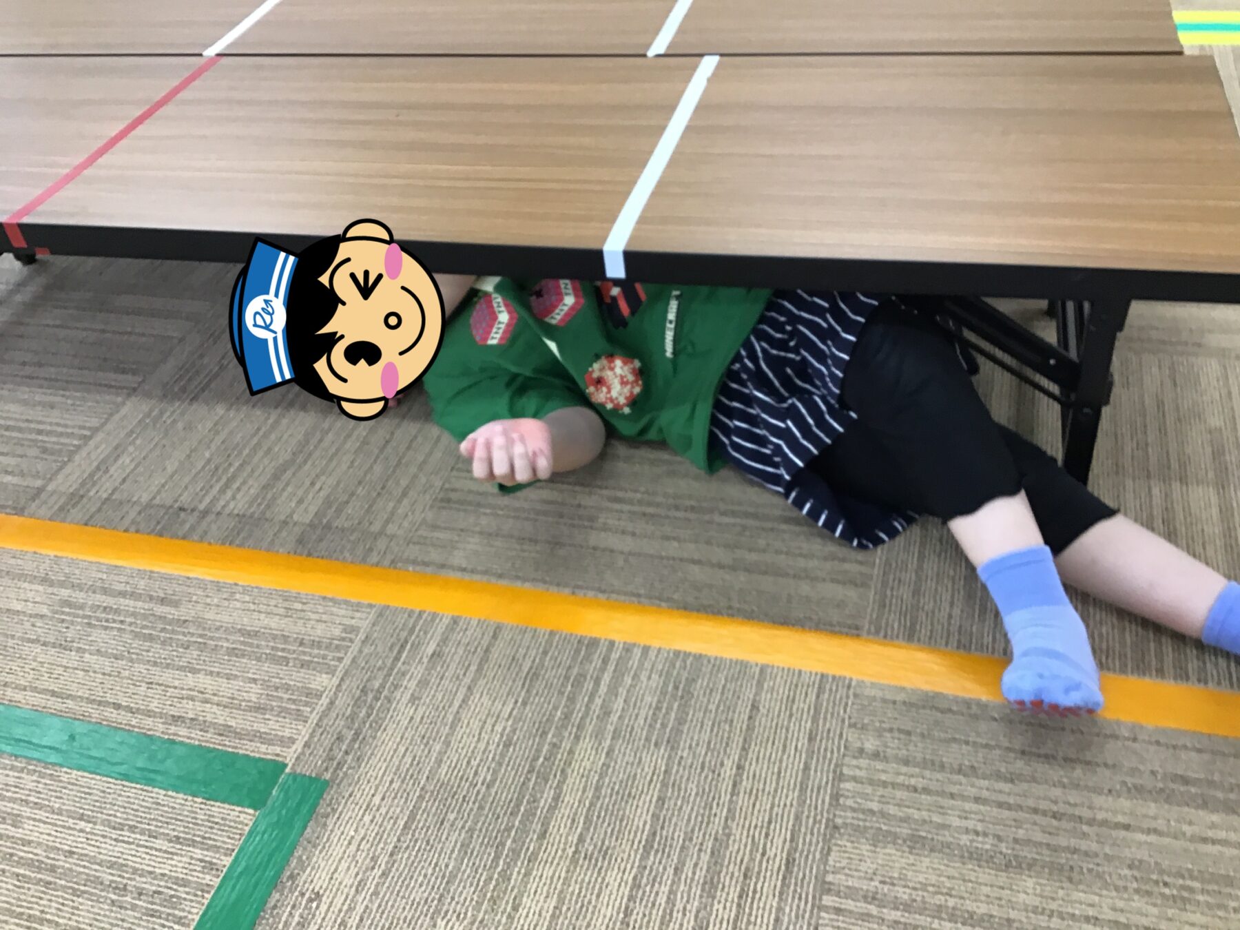 緊急地震速報の音を聞いて机の下に隠れて頭を隠す行動や避難場所の確認を行った室内の避難訓練を行いました。