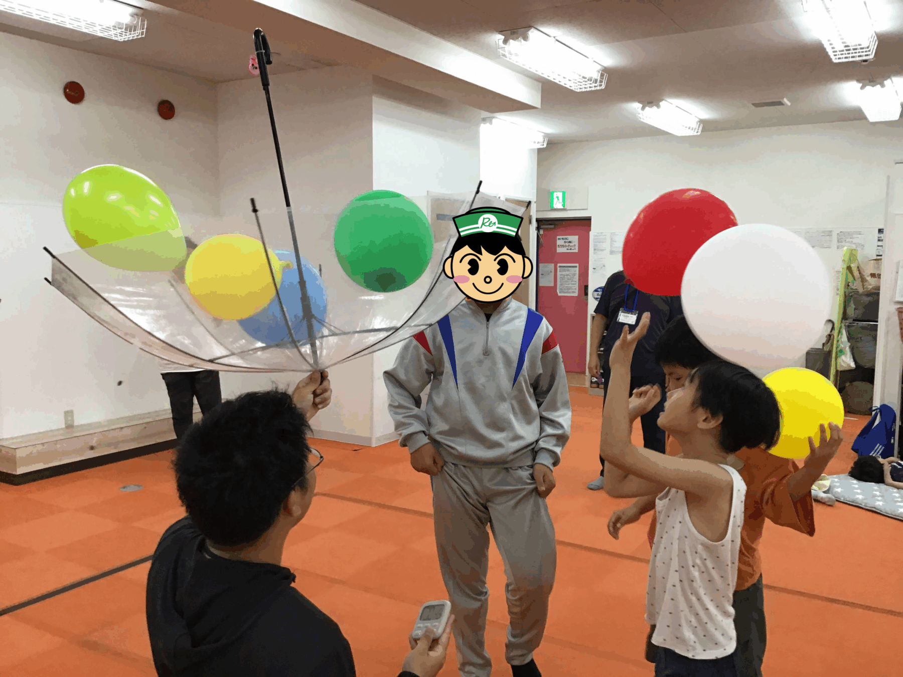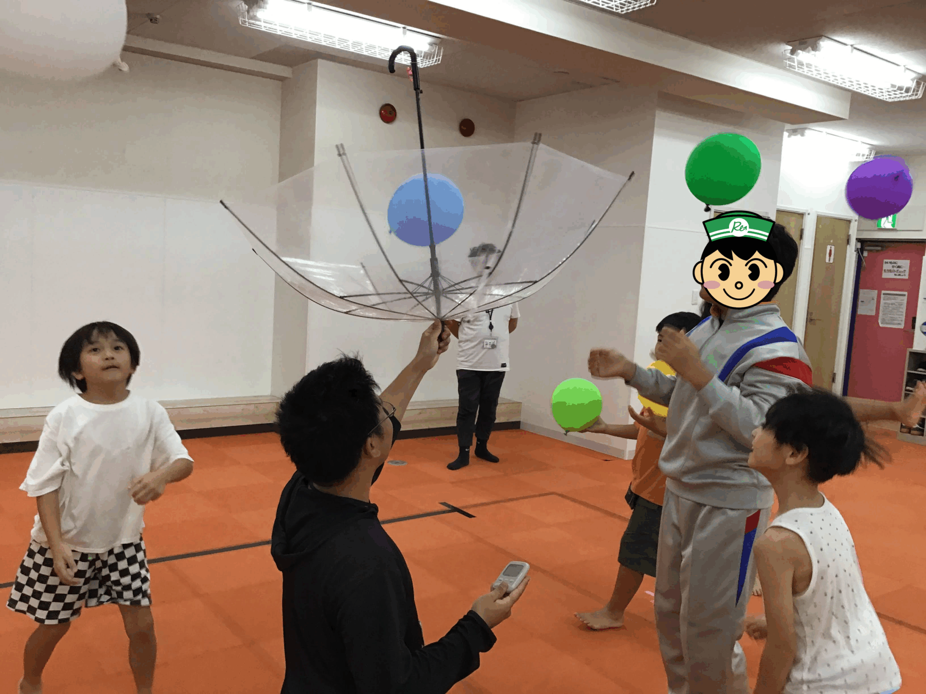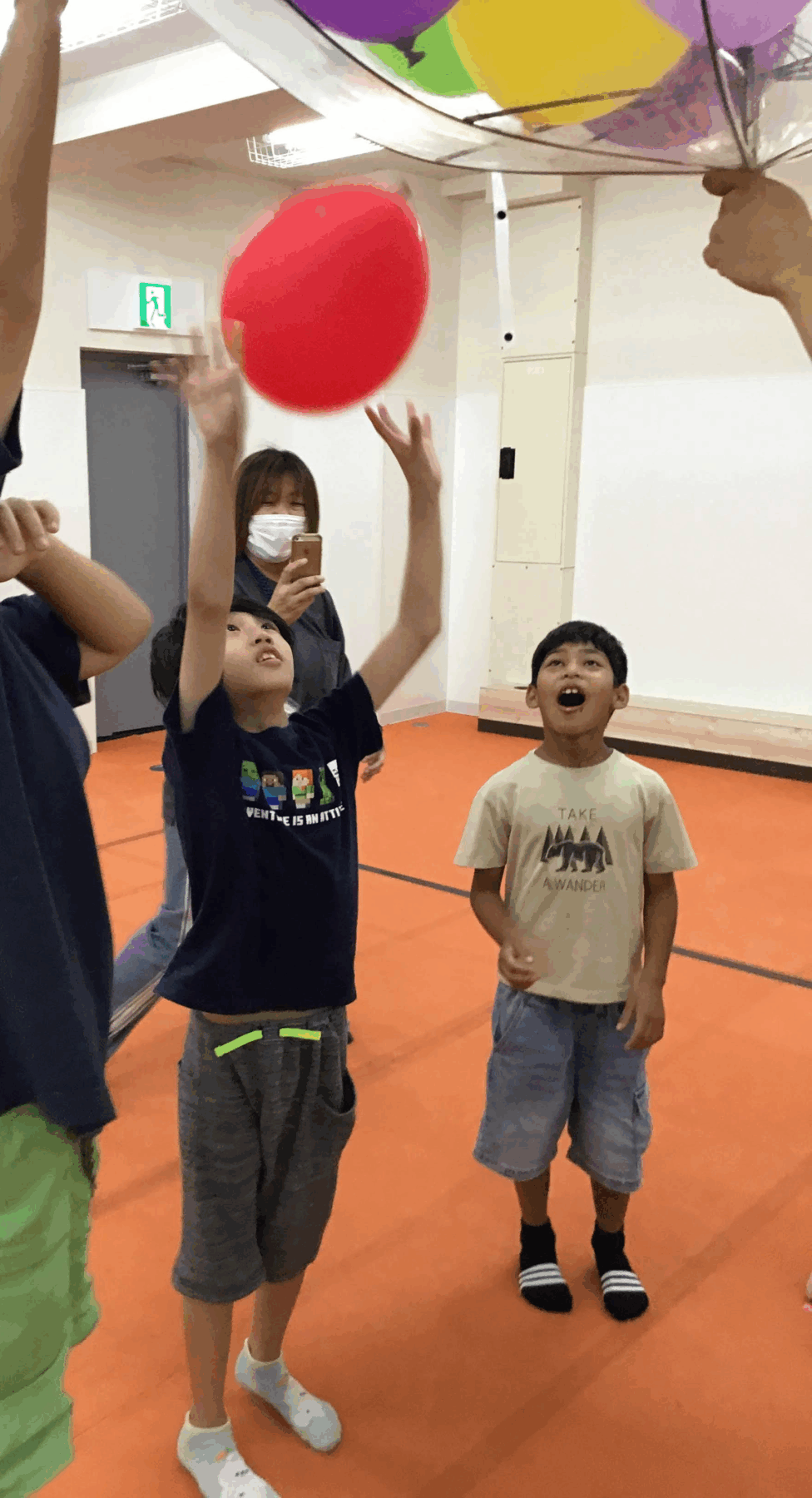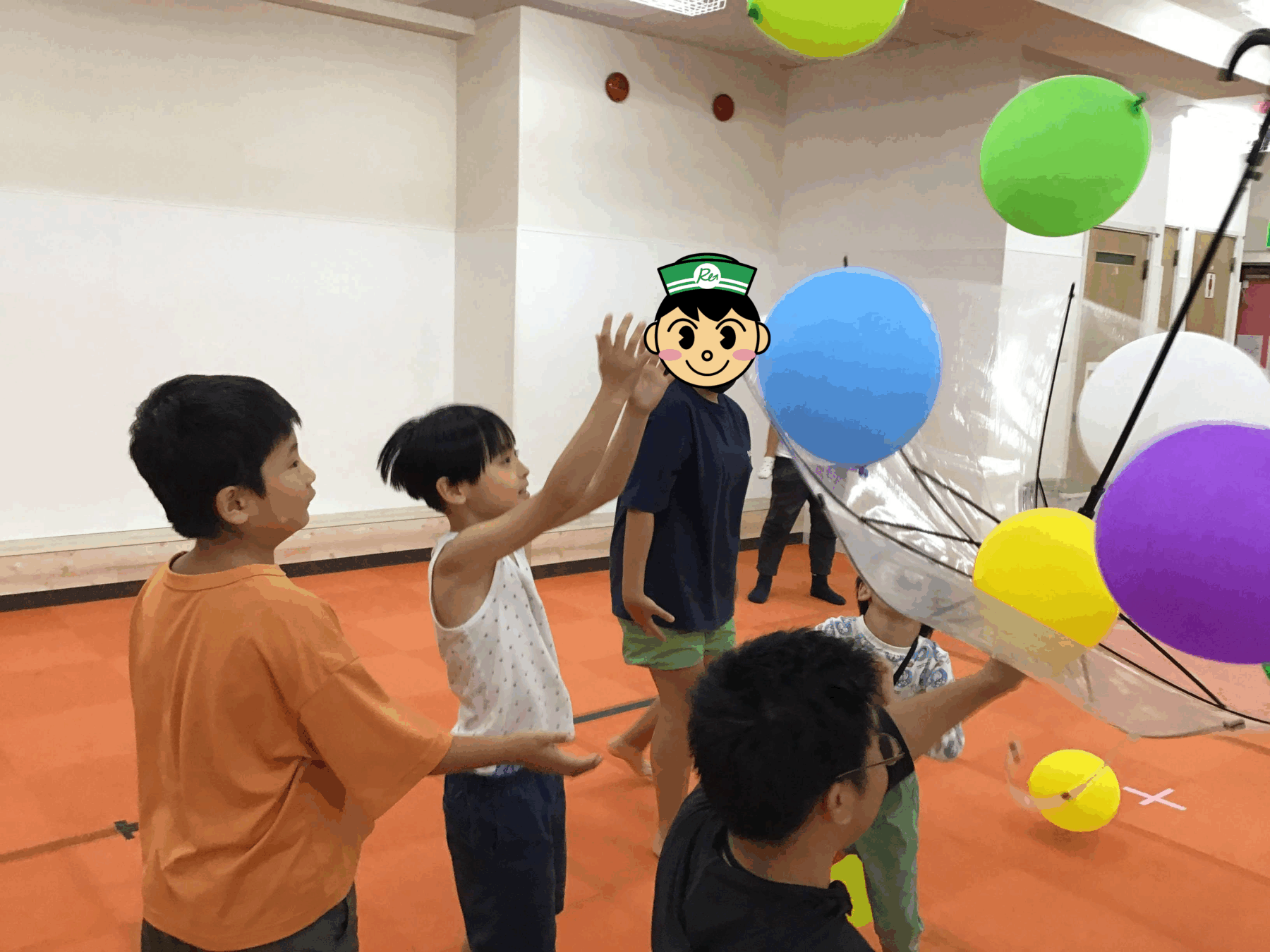 ②「風船玉入れ」は、風船を使って玉入れをします!ふわふわ飛んでしまうので結構難しいです💦