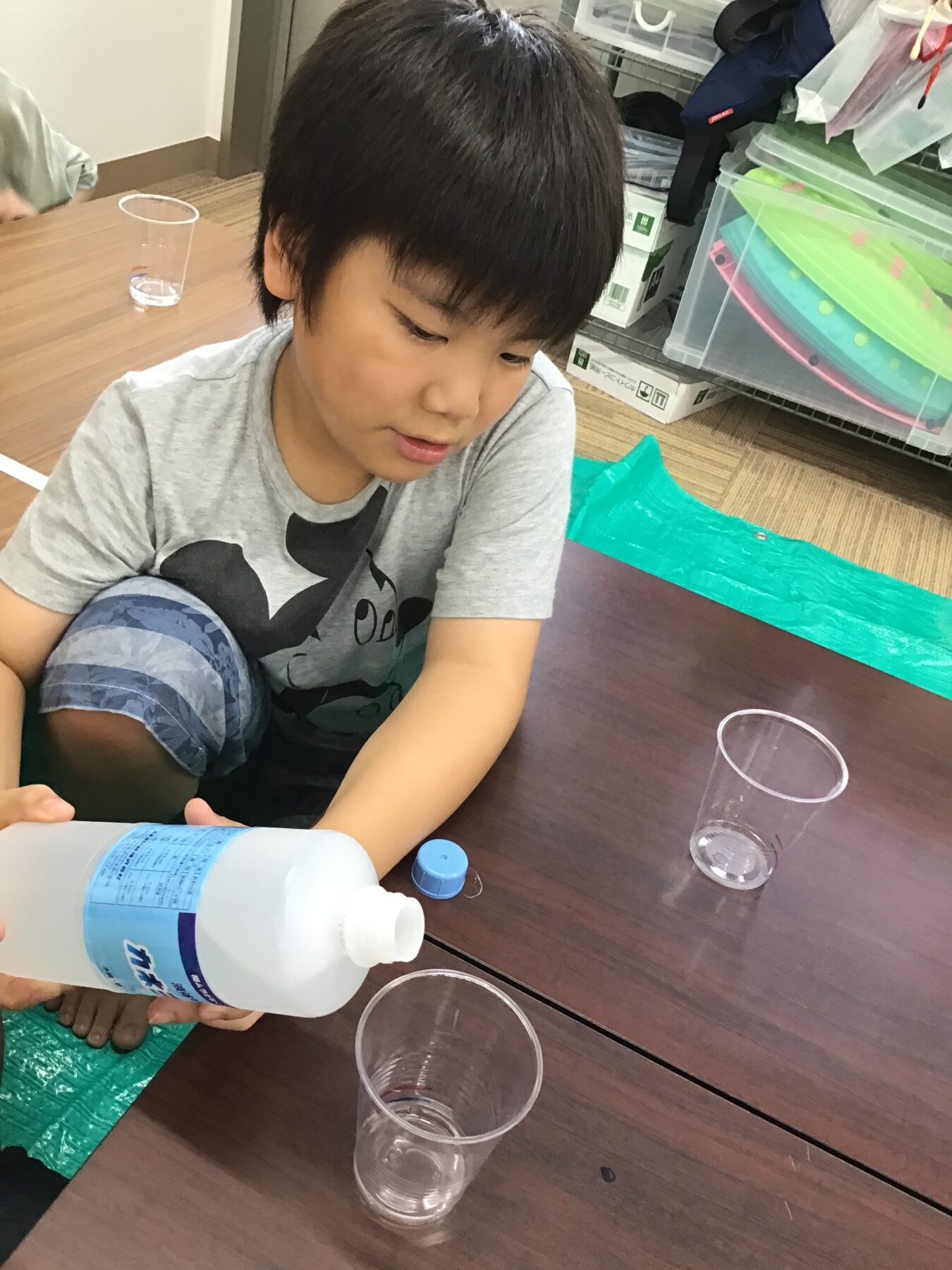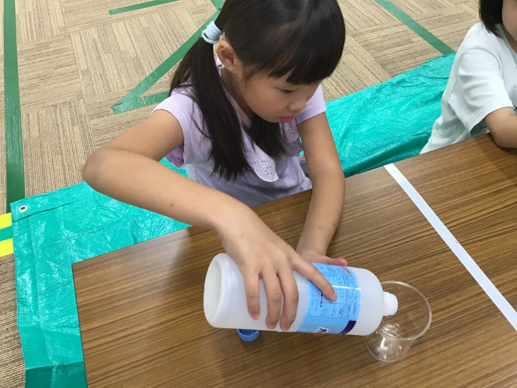 ・最初に固めのスライムを作っていただきます。水や糊を線まで入れていただきました。