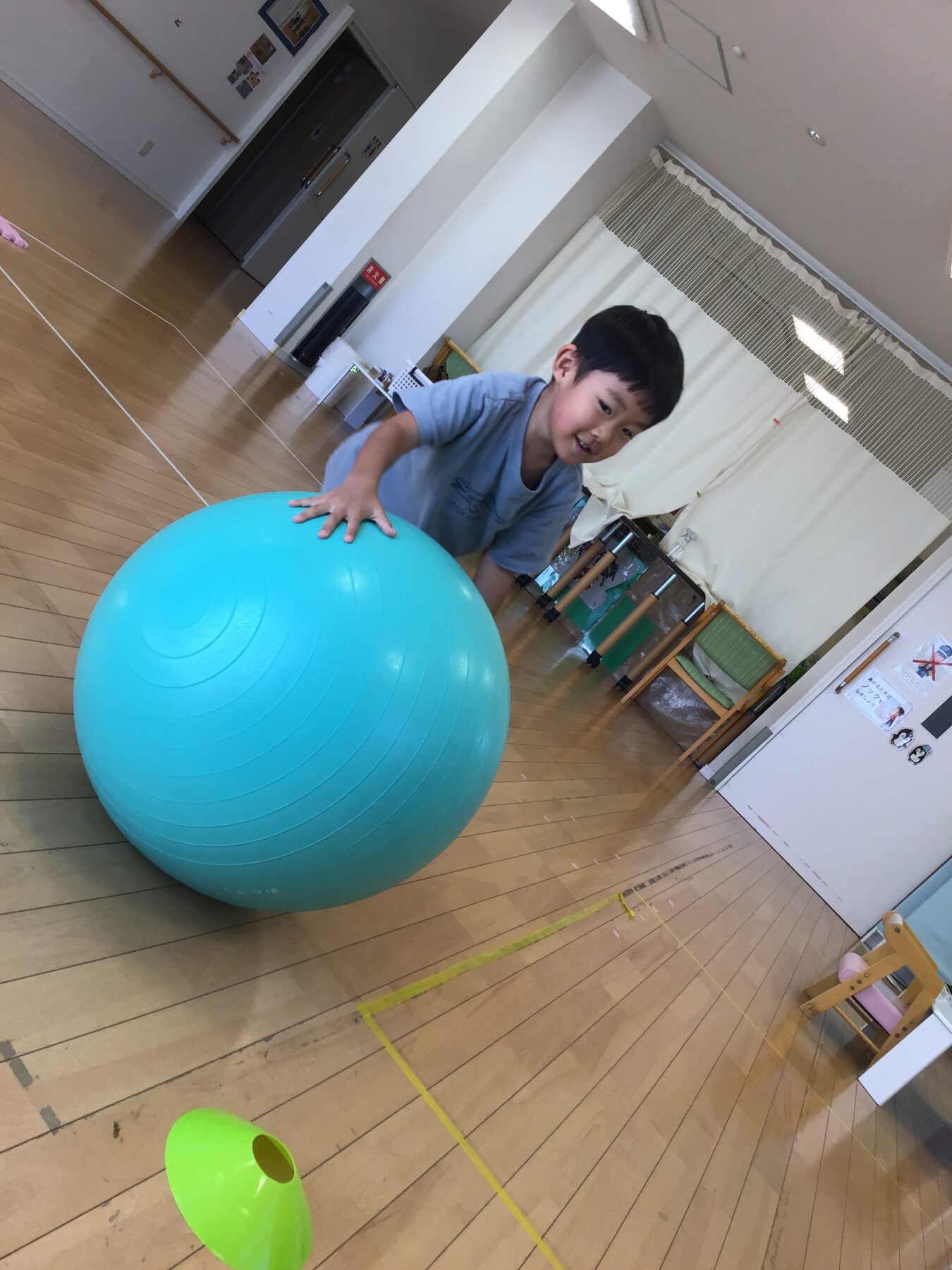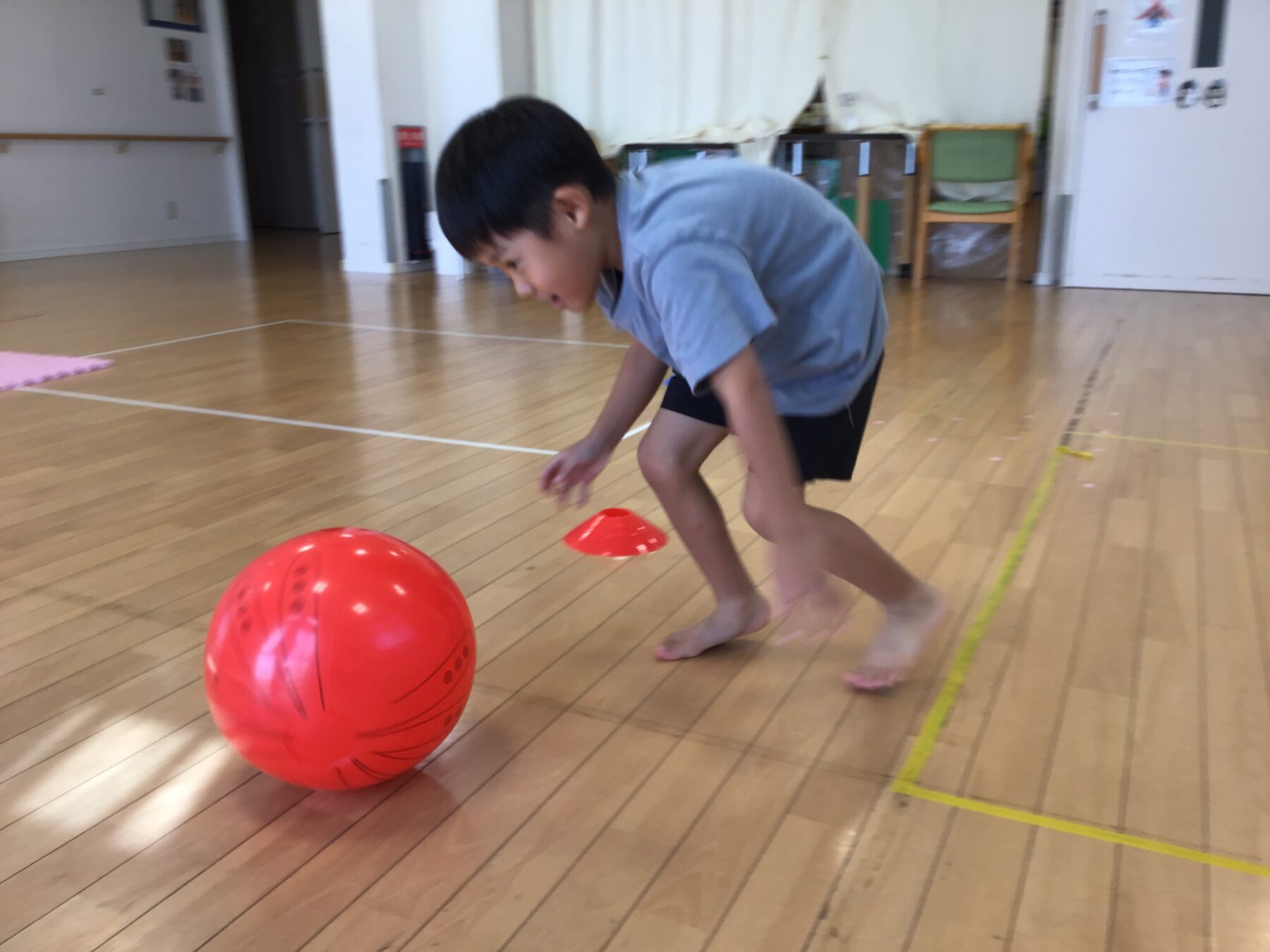 ▼色々な大きさのボールを、コーンに当たらないようにジグザグに進みます🔴