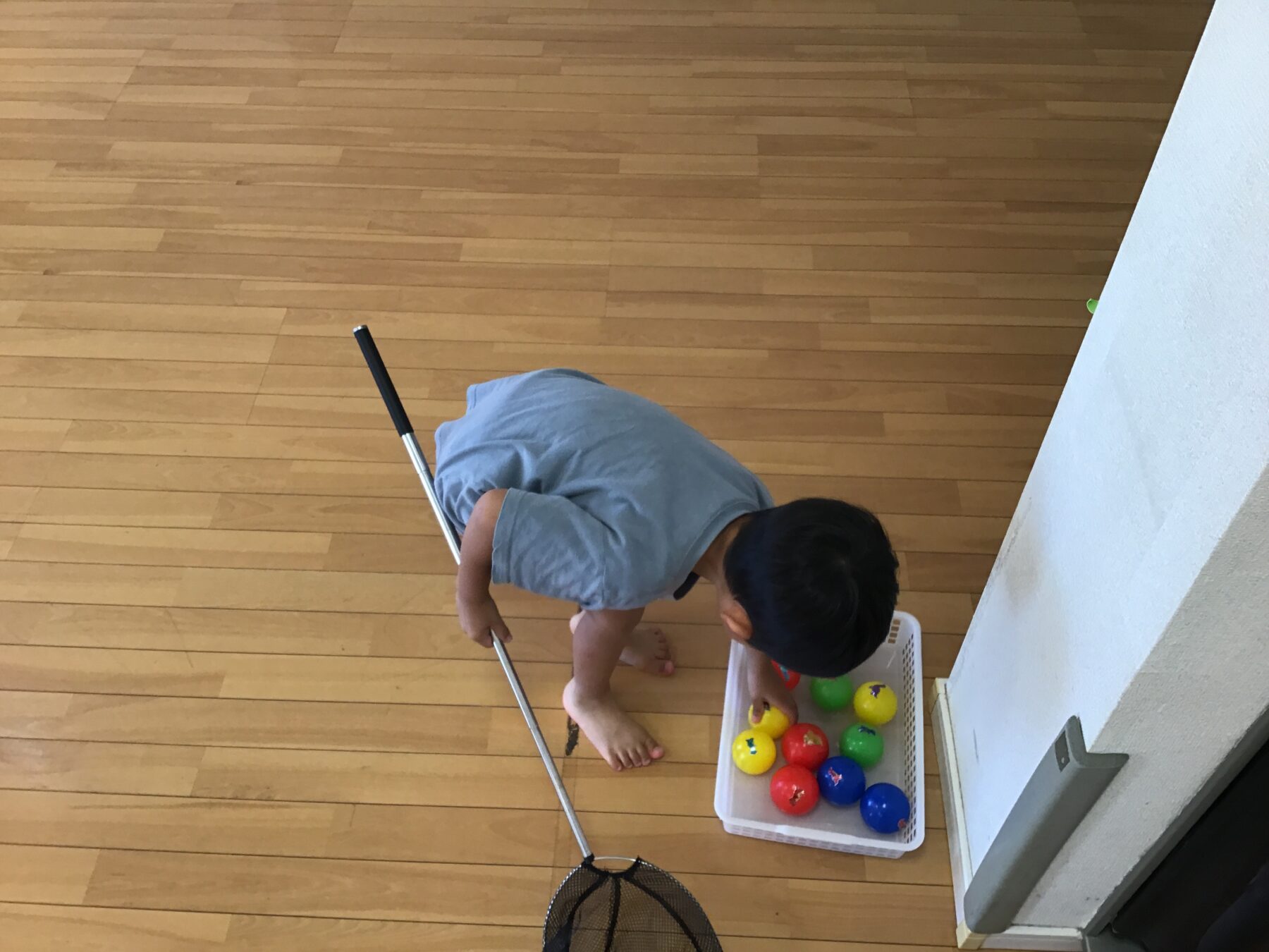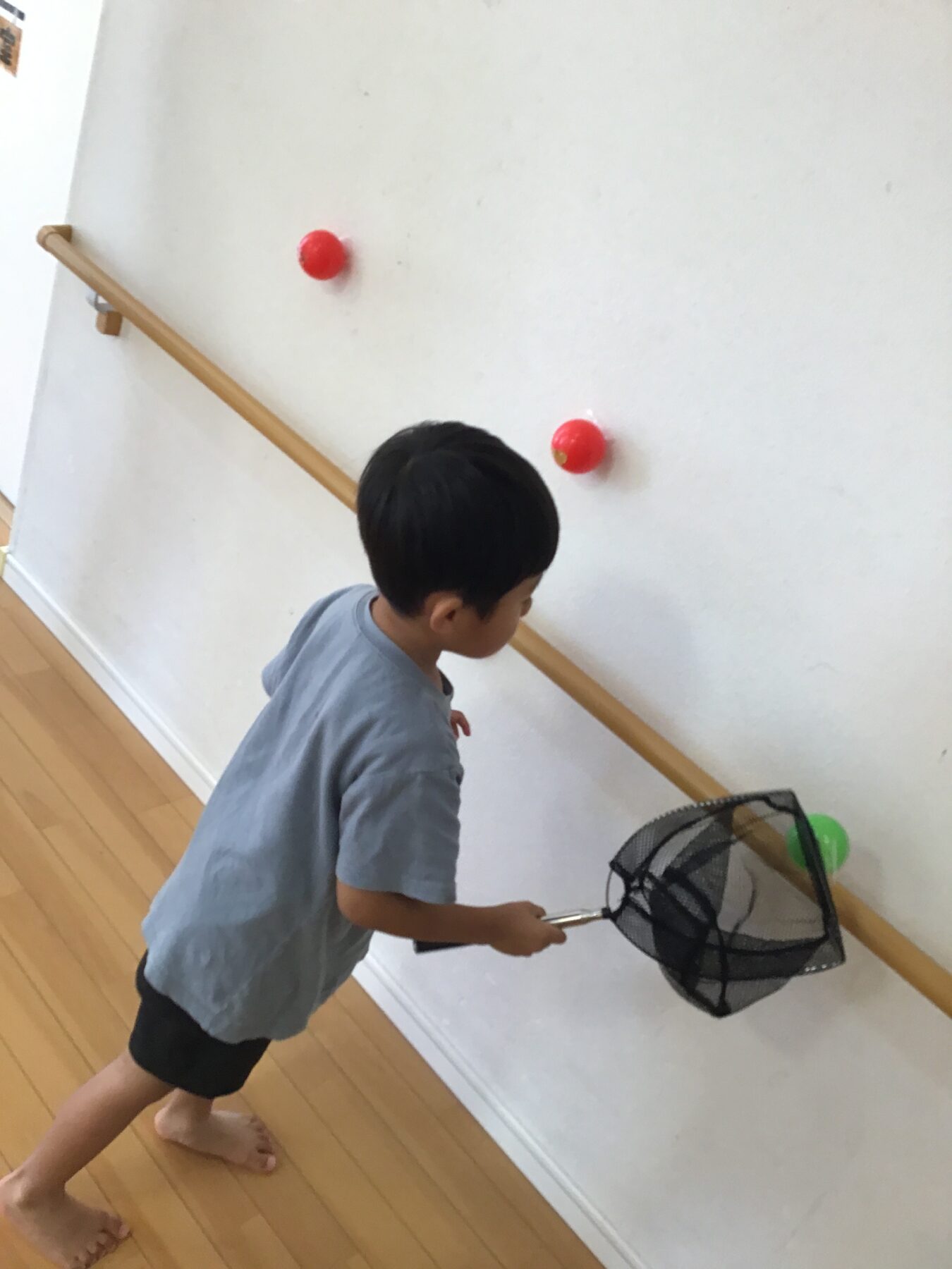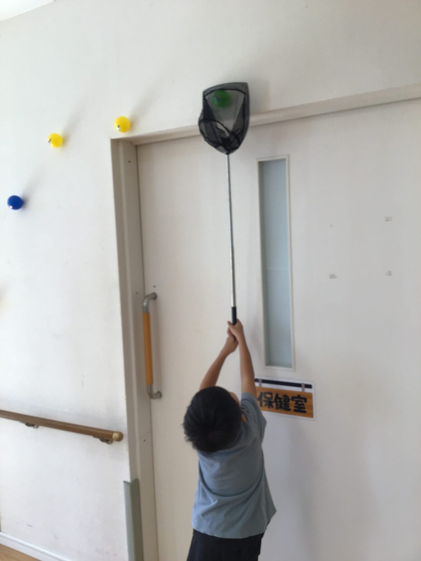 ▼恐竜シールが貼られているカラーボールを、伸びる網を使って取っていただきました。